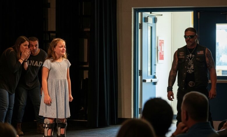 The folding table crashed to the floor as forty bikers stepped into the school auditorium,…
