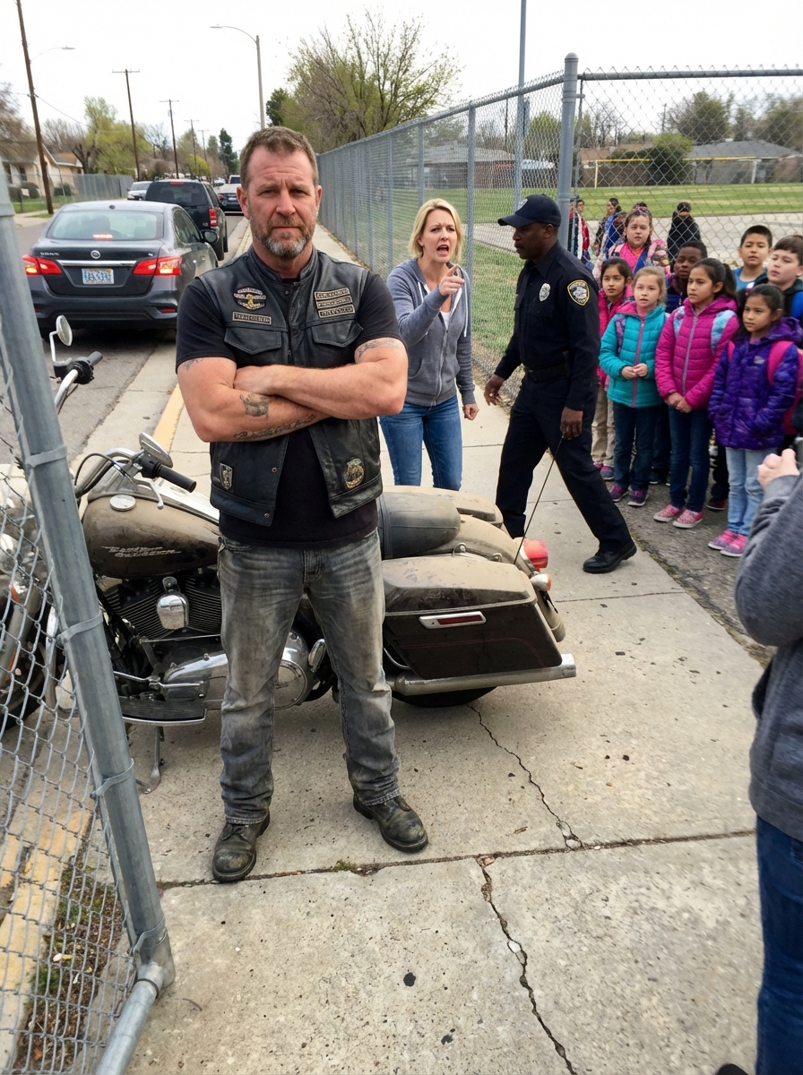 Parents began shouting as a biker stood across the school gate, blocking children from leaving and growling, “Nobody goes out yet!”—but what was he seeing that no one else could?