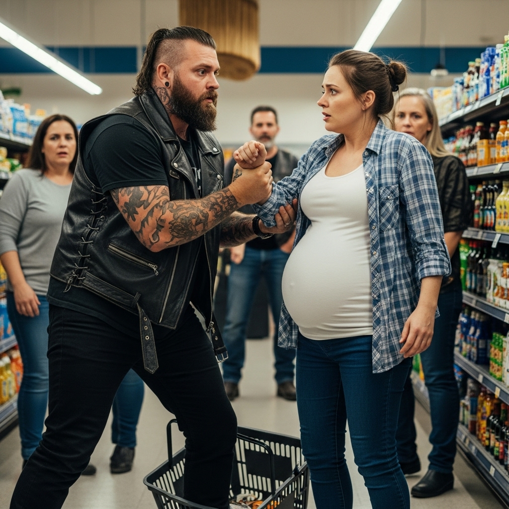 A biker seized a pregnant woman’s wrist in the middle of a crowded supermarket — and within seconds, people were shouting at him, unaware that she was about to collapse from dangerously low blood pressure.