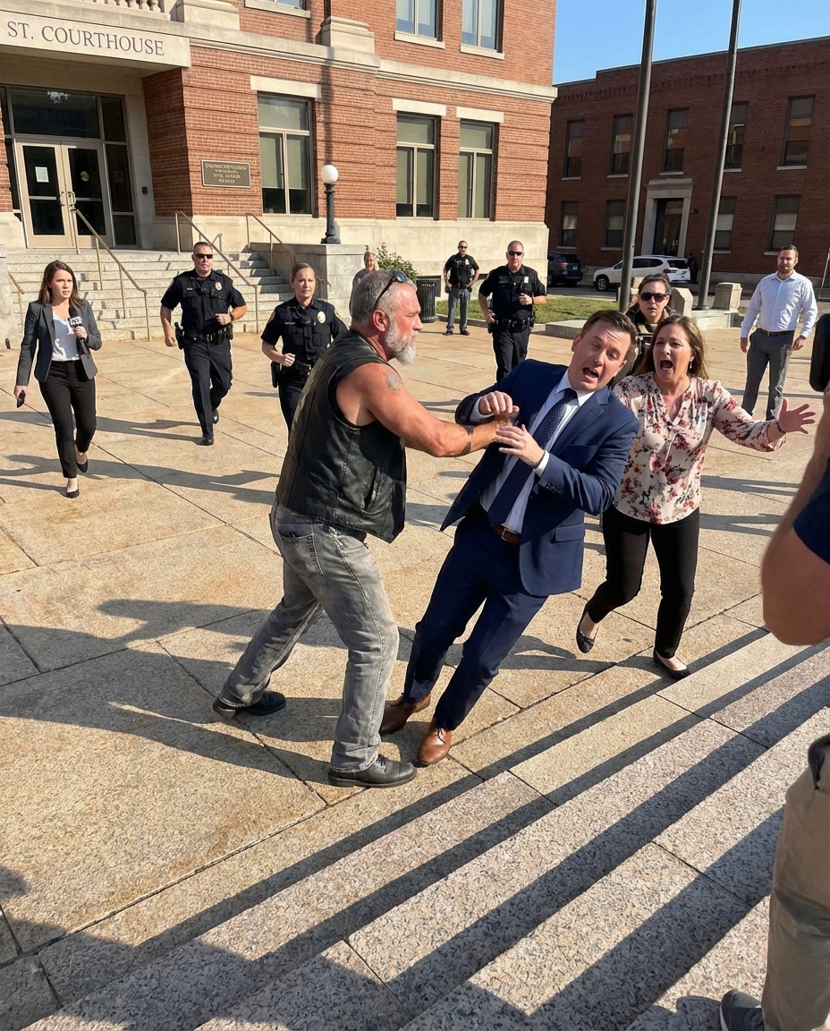 What they saw was a leather-vested man attacking someone outside a courthouse—a moment that fit every stereotype people already believed.