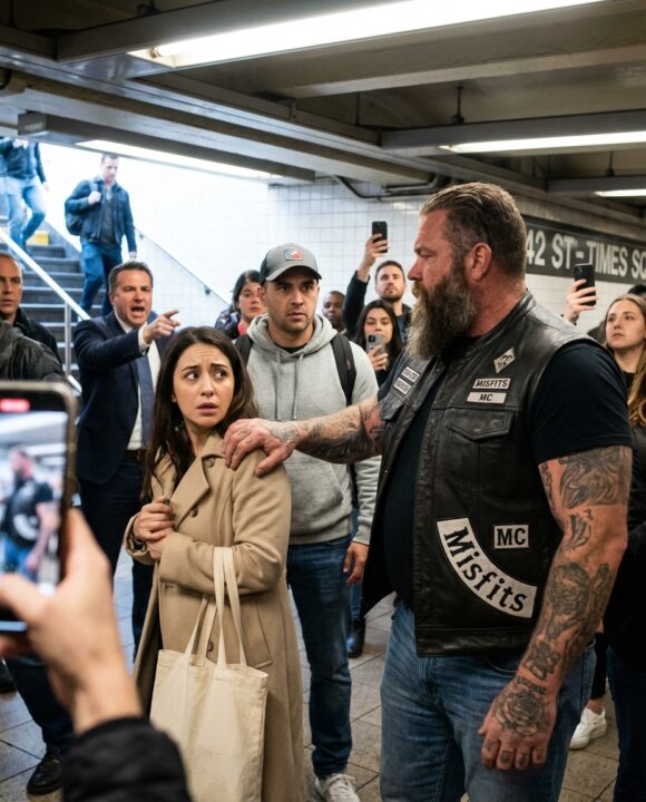 A large biker quietly placed his hand on a terrified woman’s shoulder in a crowded subway station—and within seconds, people assumed she was about to be attacked.