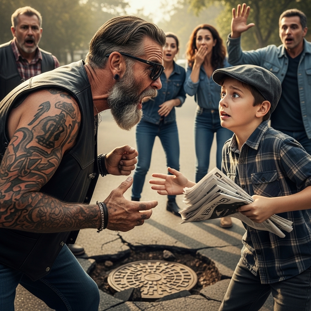 A biker suddenly screamed inches from a young paperboy’s face on a quiet street corner — and seconds later, the ground beneath the boy gave way.