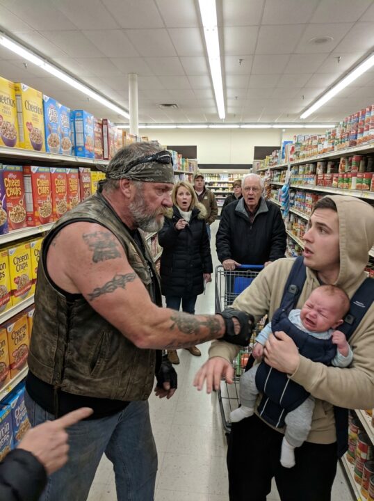 A Biker Slapped a Man Holding a Baby in a Grocery Store — Everyone Turned Against Him… Until Something Slipped From the Man’s Hand