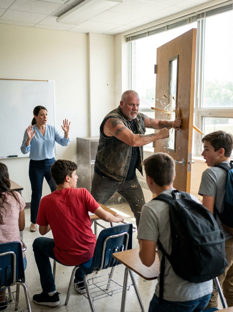 A Biker Smashed a Classroom Door Mid-Lesson—Seconds Later, Everyone Realized Something Was Wrong Inside