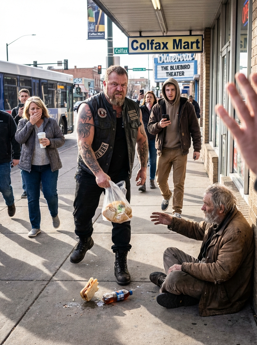 People started shouting when a biker suddenly ripped a bag of food from a homeless man and threw it onto the pavement—“What the hell is wrong with you?!”—but what had he seen that no one else did?