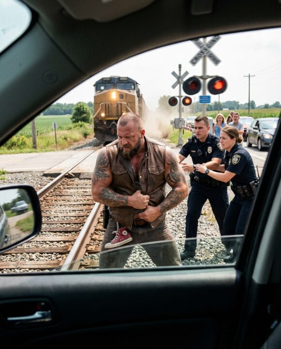 A Biker Stood Motionless on the Railroad Tracks as a Train Rushed Toward Him — When Police Dragged Him Away, They Finally Saw What He Was Holding