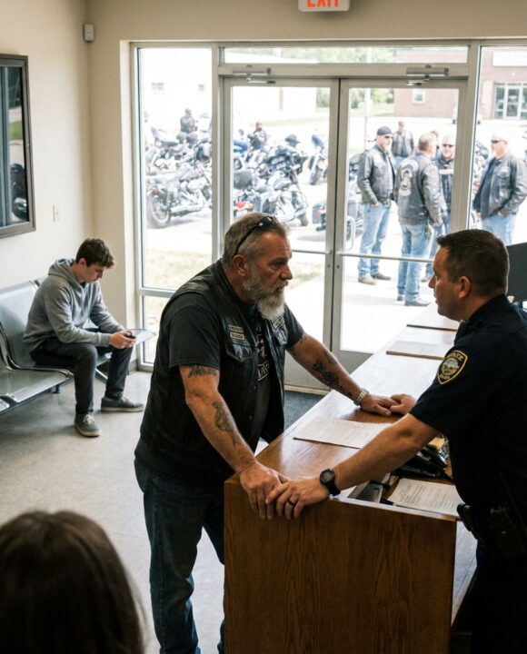 A Biker Stood Outside the Police Station Demanding They Release a Homeless Boy — And His Entire Crew Stood Silent Behind Him