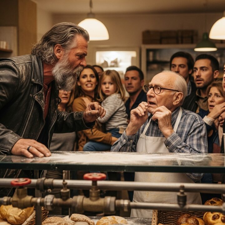 Behind the counter, Mr. Harold Benson, 72, thin-framed with shaking hands and wire-rim glasses, stared back in shock. A flour-stained apron clung to his chest. His eyes widened, heart pounding.