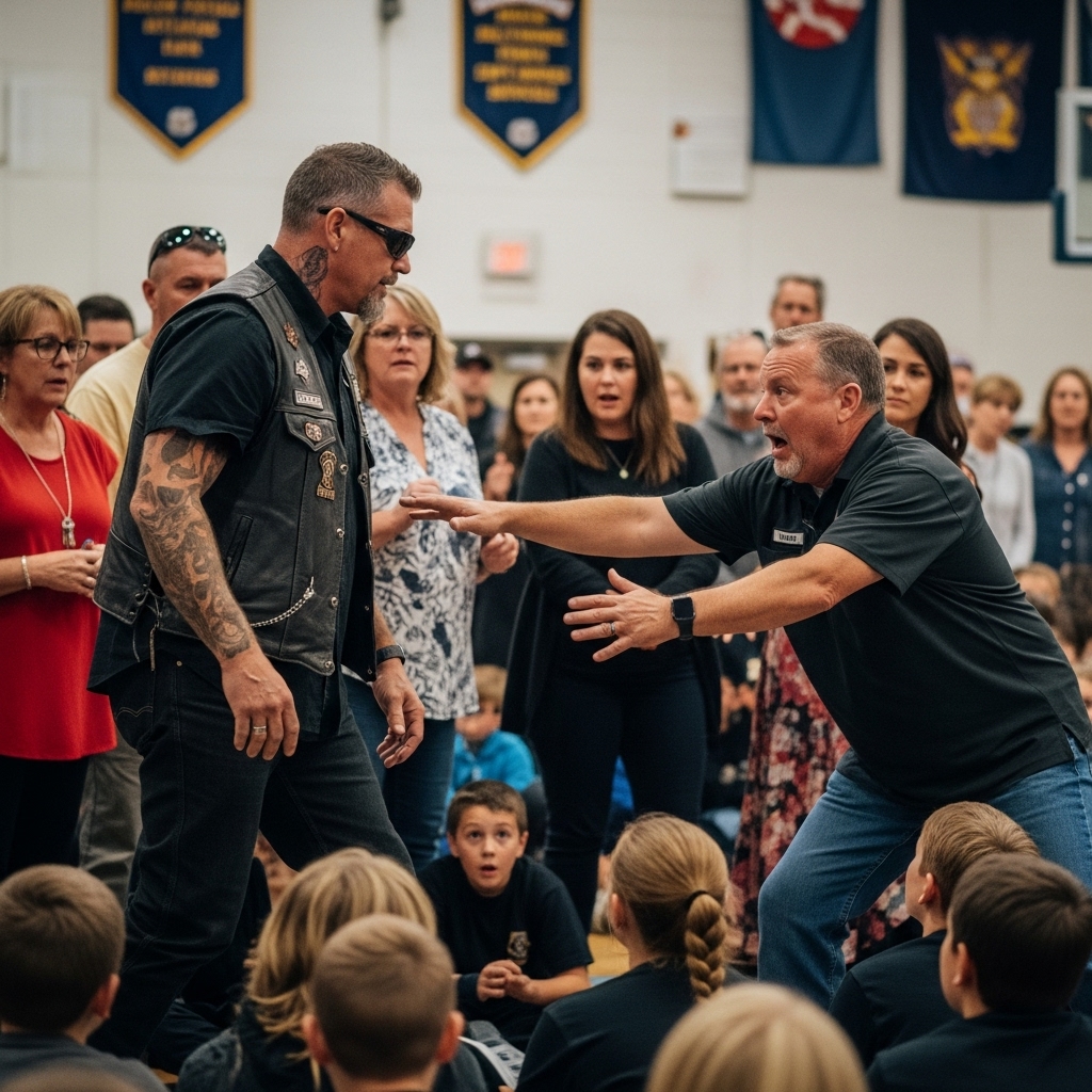 The applause died mid-clap when a leather-clad biker stepped onto a school stage, and every adult in the room instantly assumed something had gone very wrong.