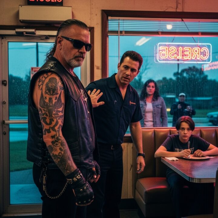 The manager stepped out from the back, wiping his hands on a towel. He’d been told there was “a situation.” He took in the scene quickly—the biker by the door, the uneasy customers, the boy by the window.