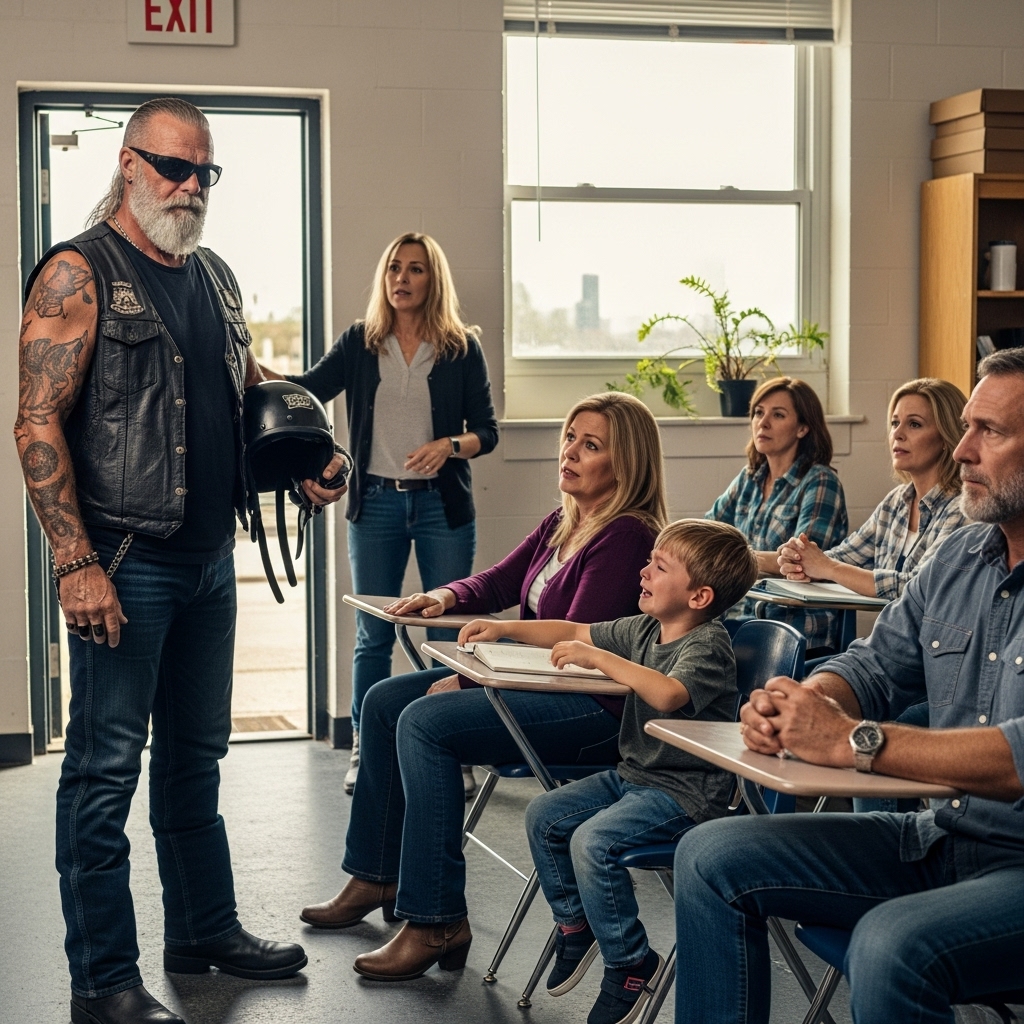 Leather vest. Sleeveless shirt. Tattoos visible beneath rolled fabric. A weathered face marked by years in the sun. From the outside, he looked like someone who didn’t belong in a quiet elementary school classroom.