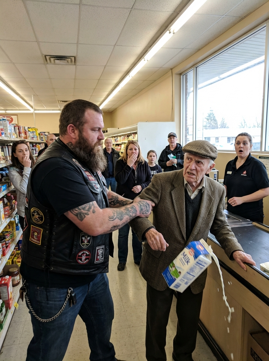 I was standing in line at a grocery store holding a small carton of milk and a receipt when a biker suddenly grabbed my jacket and yanked me backward—and seconds later, something crashed exactly where I had been standing.