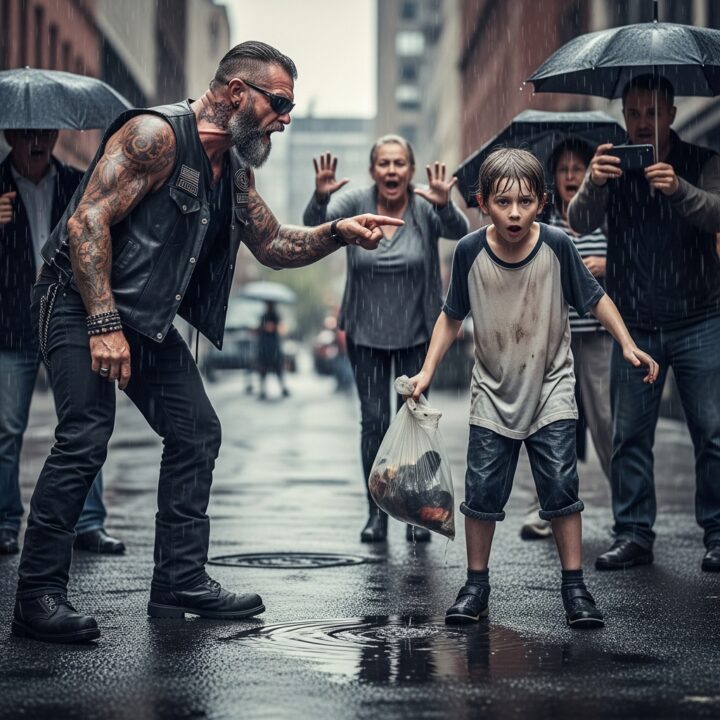 A small boy froze mid-step, one foot lifted above a shallow puddle, a plastic sack of recyclables hanging from his thin wrist. Across from him, a biker stood in the street, arm outstretched, voice loud, sharp, unforgiving.