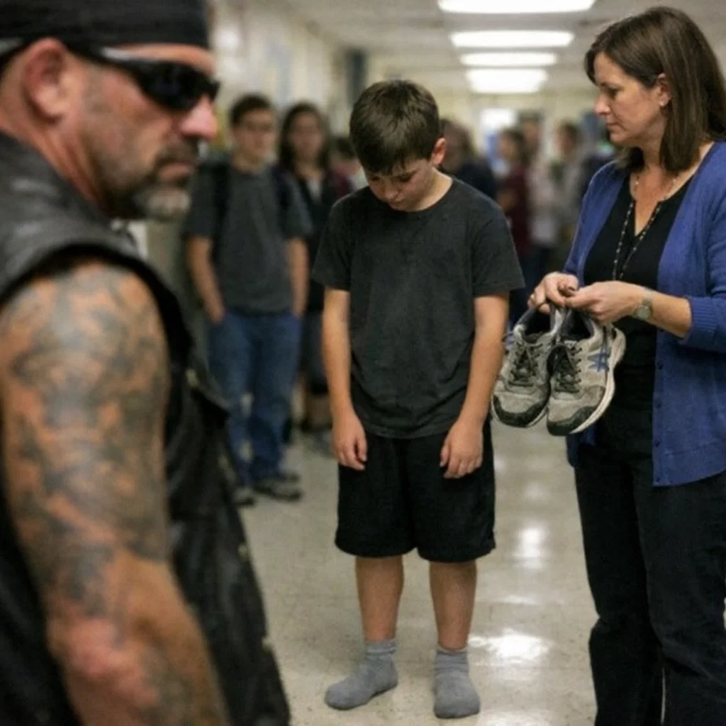 The biker looked around. At the kids watching from doorways. At the teachers pretending this was procedure, not cruelty.