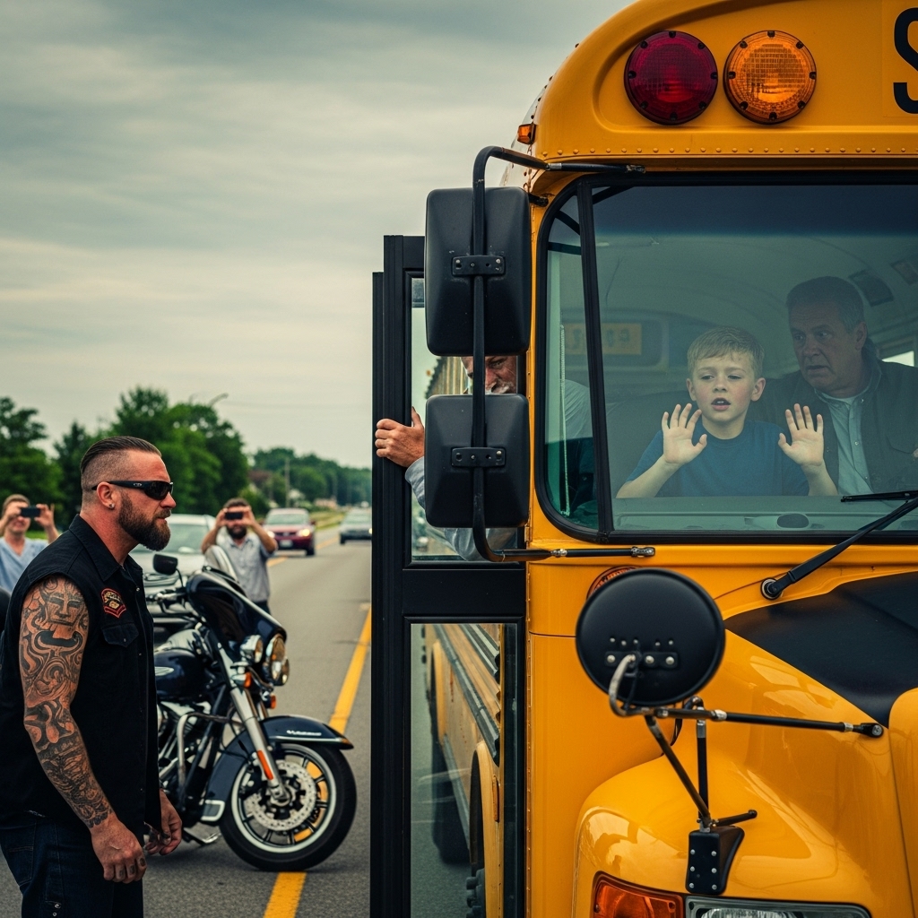 The biker didn’t raise his voice. He didn’t apologize. He peered through the bus window, one hand shading his eyes. He saw the boy. The fogged glass. The small fists slipping down the pane.