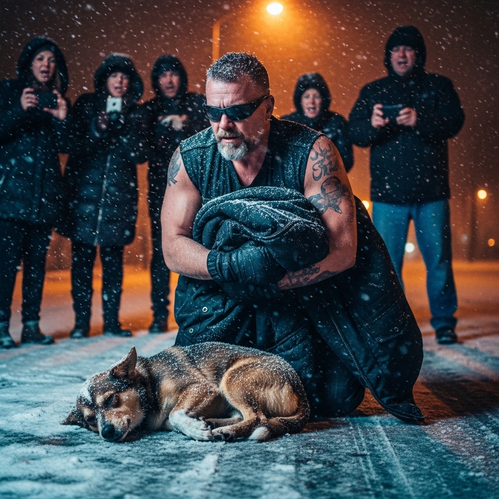 The biker wrapped the jacket around the dog anyway, careful, deliberate, tucking it under the shaking body. The dog flinched at first, then sagged into the warmth.
