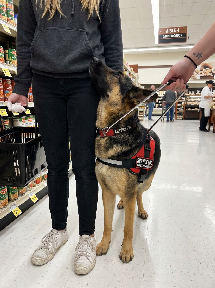 When they passed men — neighbors, delivery drivers, maintenance workers — Atticus did not growl. He did not bark. He did not bristle. He simply turned his head, very slightly, toward Becca’s leg. He pressed his shoulder a little firmer against her thigh.