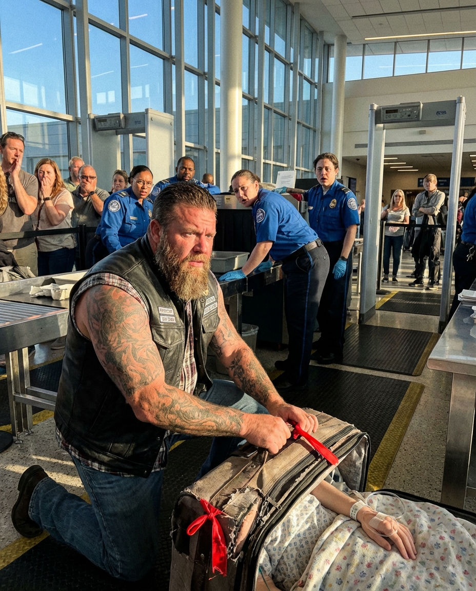 The massive biker didn’t argue with airport security, didn’t shout, didn’t even look angry — he simply dragged an old battered suitcase into the middle of the checkpoint line and unzipped it himself, right in front of everyone.