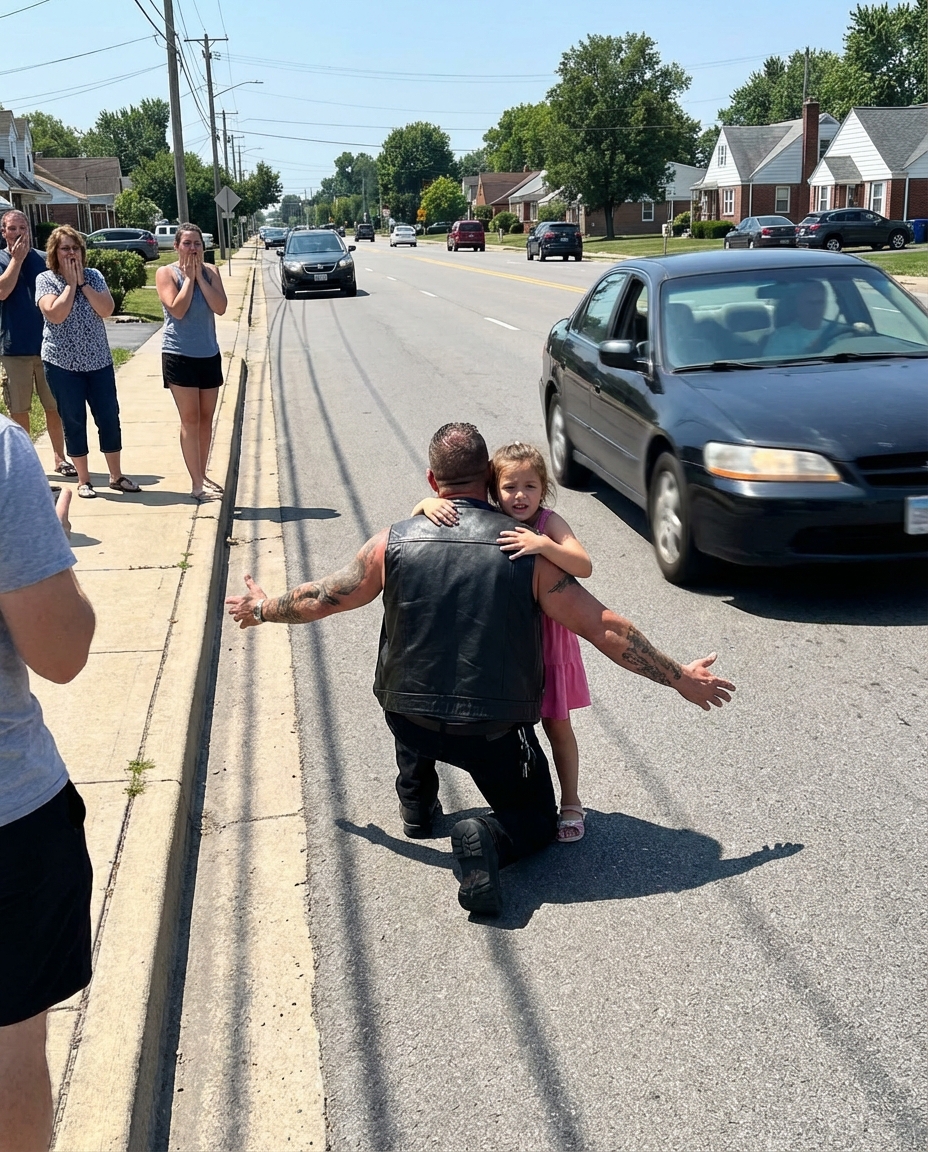 “In the middle of a busy street, a giant biker suddenly dropped to his knees in front of a little girl, blocking traffic with his own body—why would anyone risk their life like that in broad daylight?”