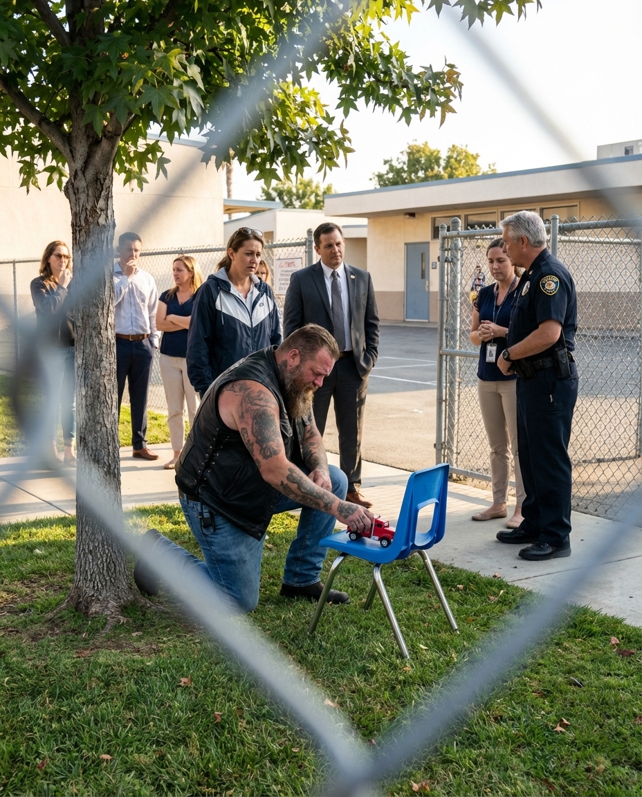 The security guard said it quietly, almost like a warning, just as the massive biker lowered himself onto one knee in front of a small plastic chair sitting alone in the middle of the elementary school courtyard.