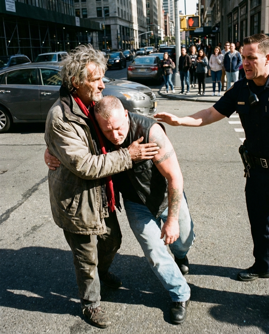 A dirty homeless man suddenly grabbed and held a massive biker in the middle of a busy street, refusing to let go—even as police rushed in, thinking he was attacking him.