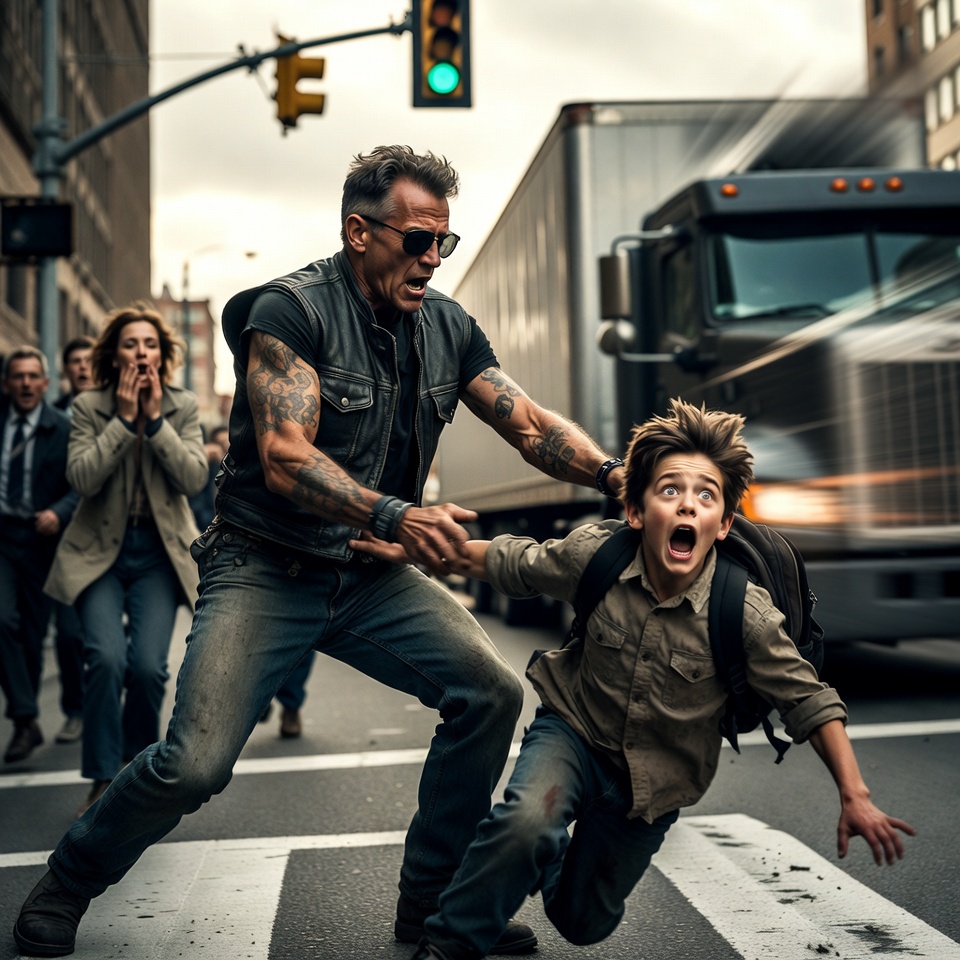 The boy hit the asphalt hard, backpack skidding across the white stripes. His palms scraped raw. His breath came out in short, panicked bursts.