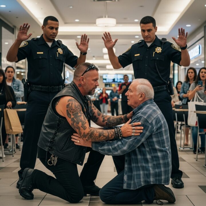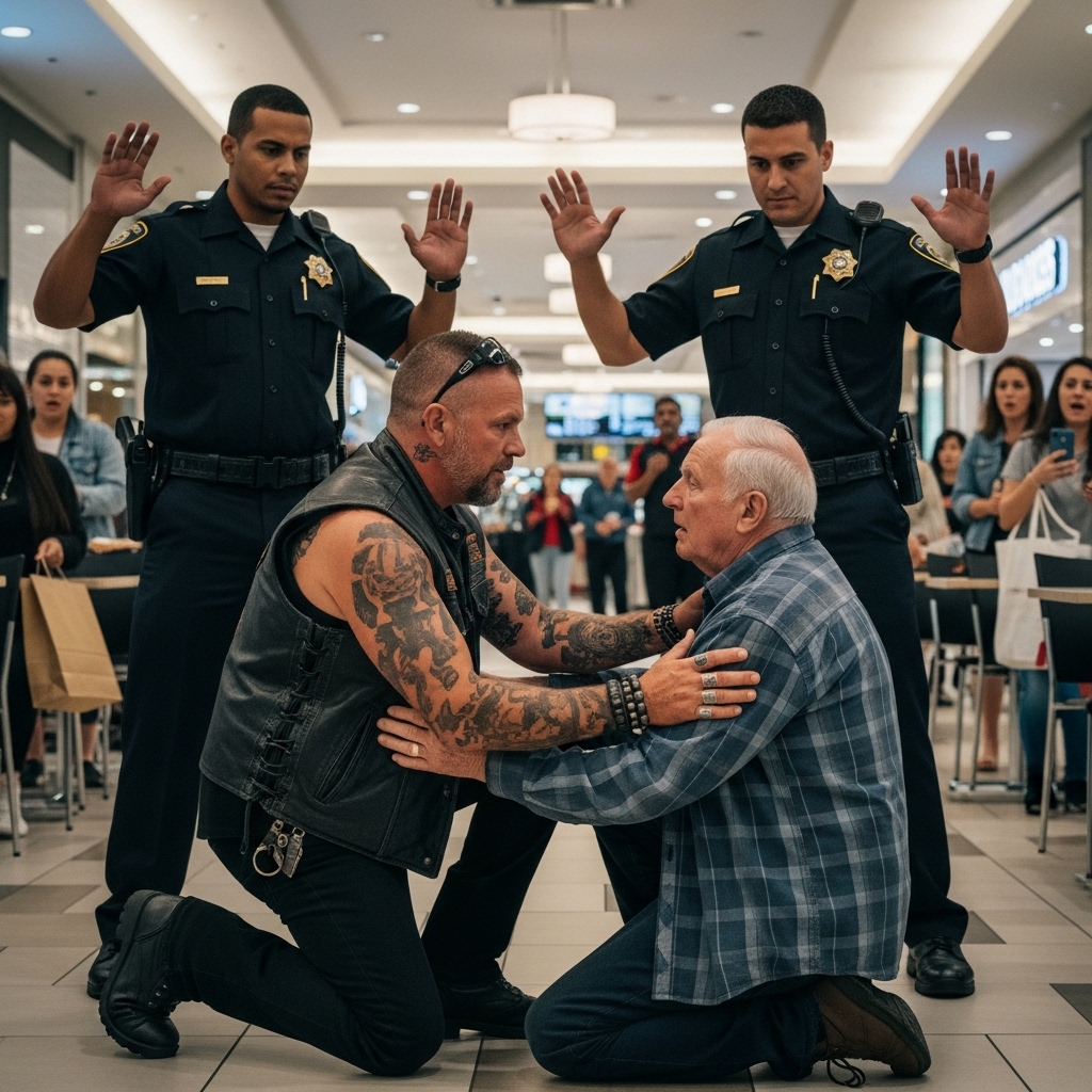 Two mall security guards moved in fast, hands already hovering near their belts. Their eyes skipped past the man on the floor and locked onto the biker instead — because danger always looks a certain way.