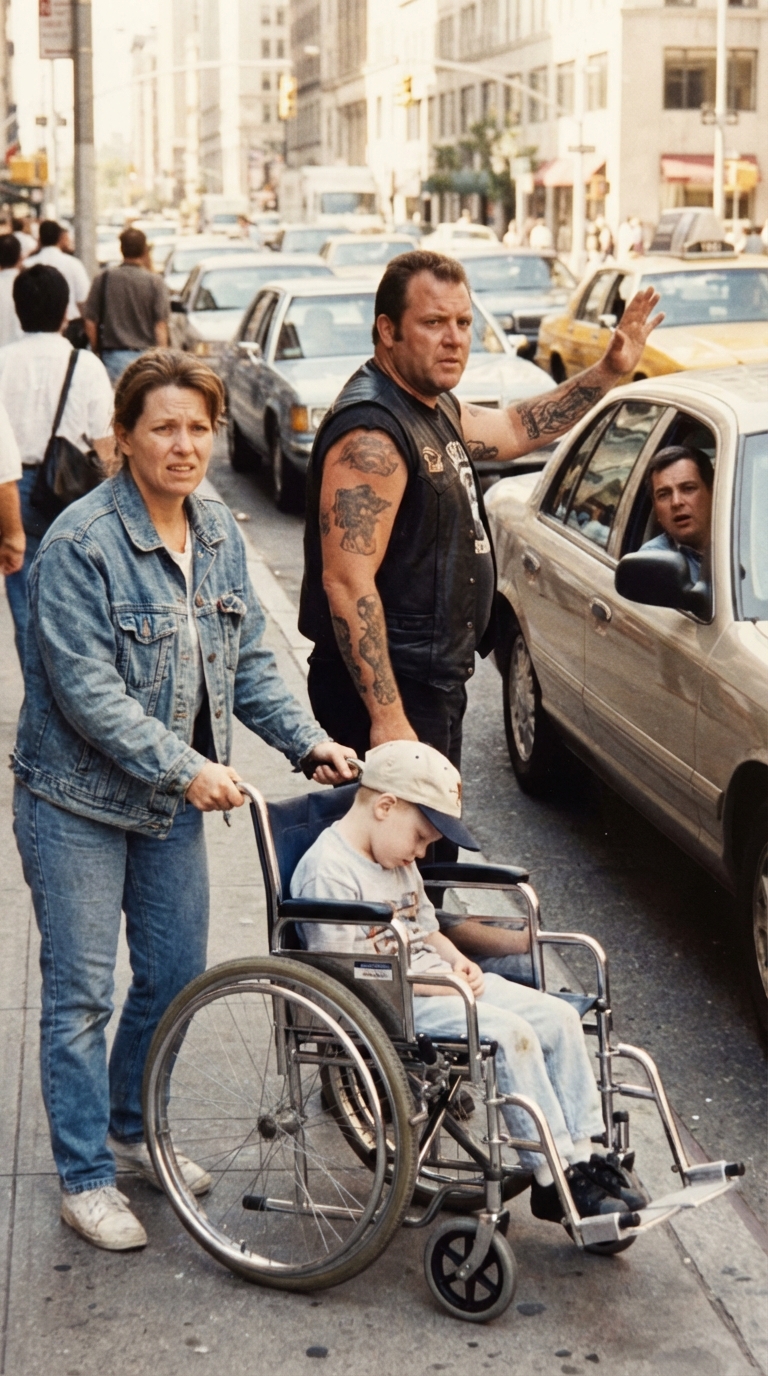 The mother’s hands shook on the wheelchair handles. Her son looked up at her, eyes wide, confused by the sudden stillness — by the man standing where cars were supposed to be.