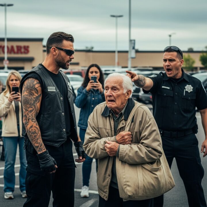 The tension thickened. The old man shrank behind the biker now, almost instinctively, like a child stepping behind an adult during a storm.