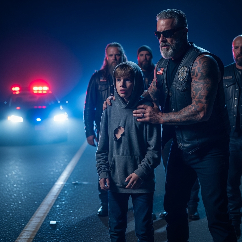 The biker didn’t argue. He didn’t raise his hands either. He just shifted his stance—barely—so the boy was shielded from the road, from the headlights, from whatever had chased him there.
