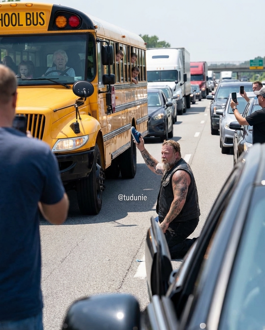 A Tattooed Biker Knelt in the Middle of a Highway in Front of a School Bus — When the Door Opened, the Driver Broke Down in Tears