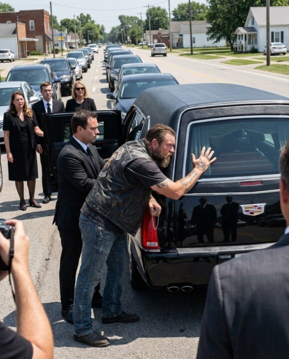 The tattooed biker stood in the middle of the road with both arms spread wide, forcing an entire funeral procession to brake to a halt—because he was certain the person he had been searching for was inside the coffin.