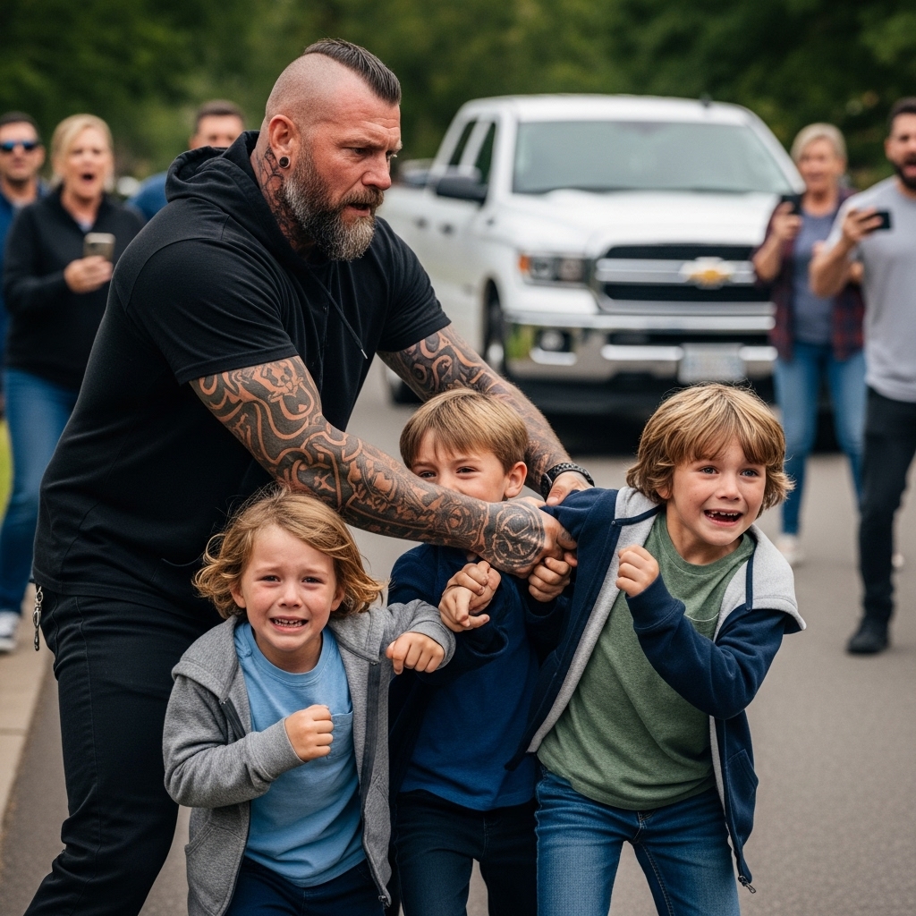 The children — Liam, 8, and Noah, 6 — shook violently. Their faces were pale. One of them cried into the man’s jacket, fists balled tight.