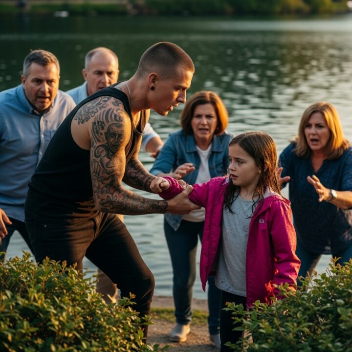 A tattooed young man grabbed a little girl’s wrist in the park — and nine seconds later, adults tackled him to the ground, unaware she had stepped inches from a deep lake
