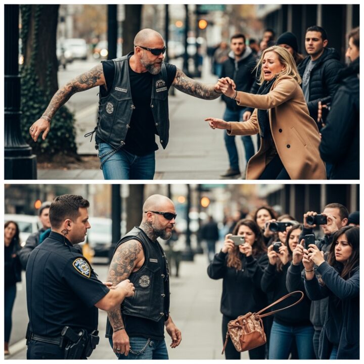 The officers took in the scene in seconds: the crowd, the biker, the shaken woman, the purse on the pavement. Their hands hovered near their belts, trained to read threats before stories.