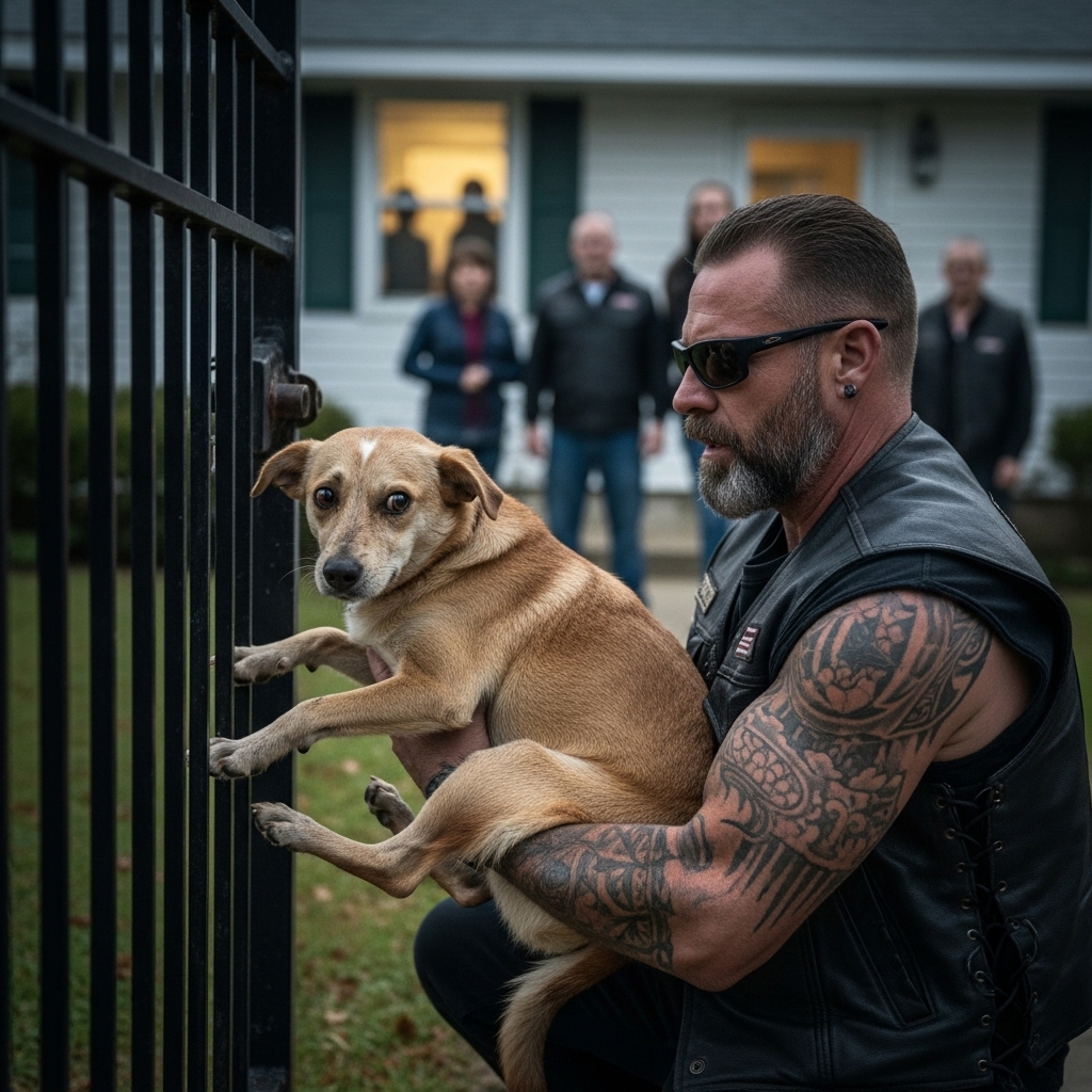He turned slowly, dog still in his arms. The dog’s paws clutched the biker’s vest, claws catching slightly in the leather.
