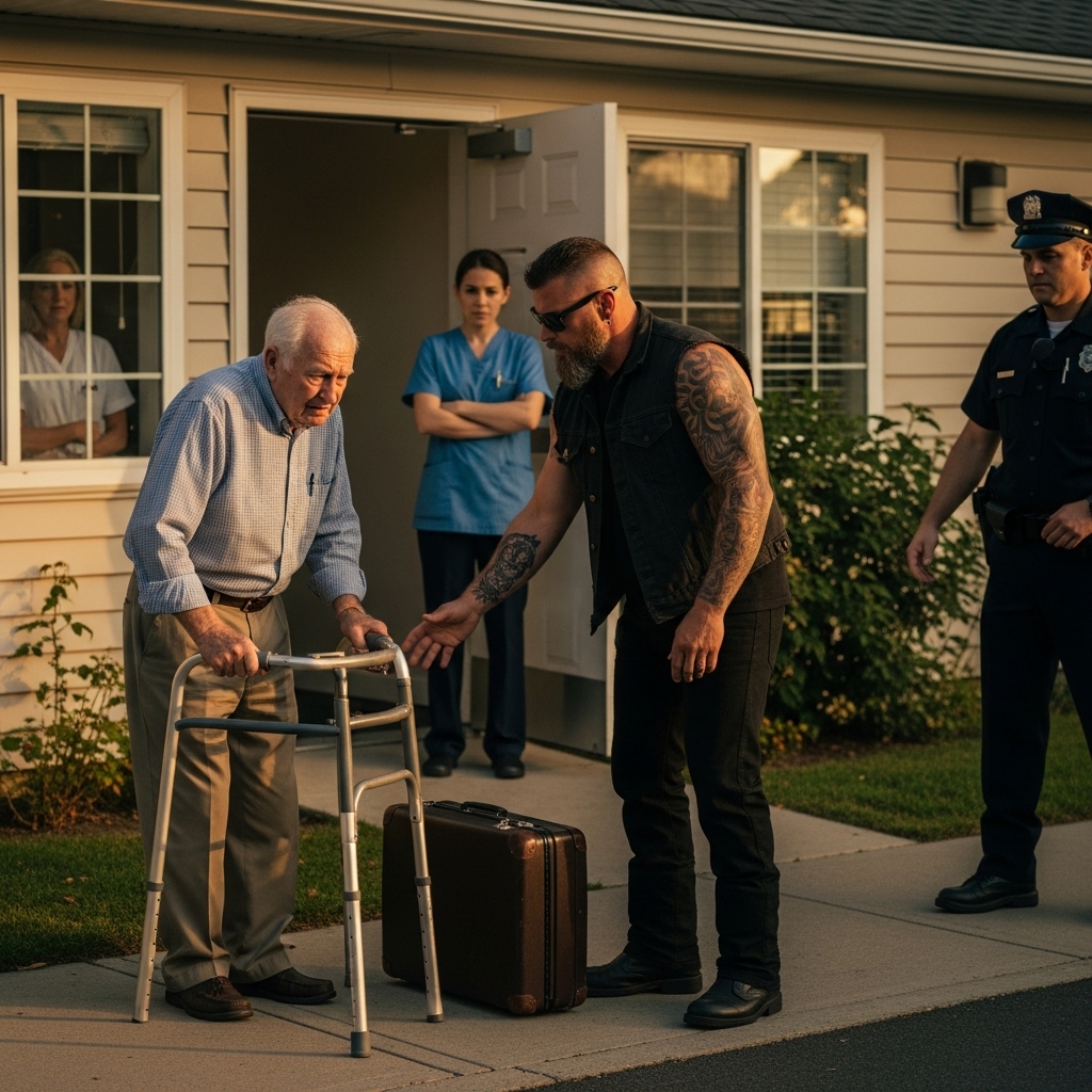 The biker didn’t argue. He glanced at the old man’s shoes—one lace broken, taped together. He picked up the suitcase and felt how light it was. Too light for a life.