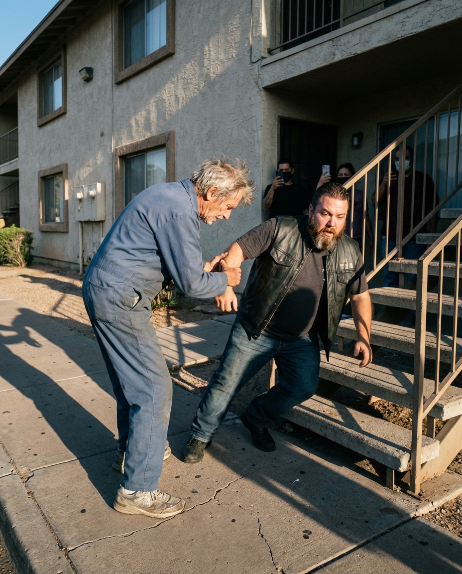 “Get off me!” the biker barked as an old janitor suddenly grabbed him and yanked him down the stairway—right in front of a crowd that thought they’d just seen an attack.