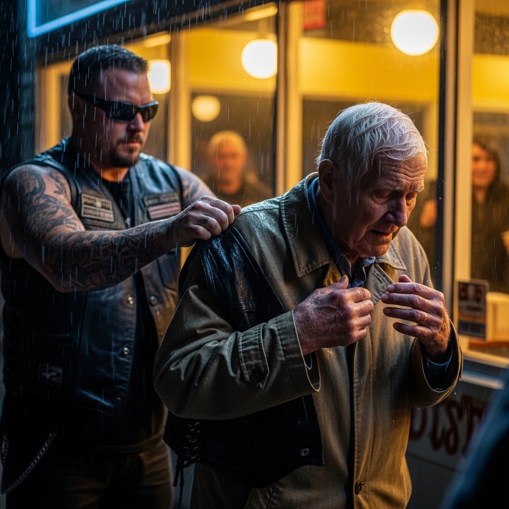 An Old Man Was Forced to Stand in the Rain Because He “Wasn’t a Customer” — Then a Biker Took Off His Vest