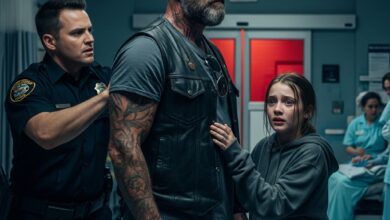 The ER doors flew open.“Sir, you need to leave. Now.” The security guard’s hand pressed flat against the biker’s leather…
