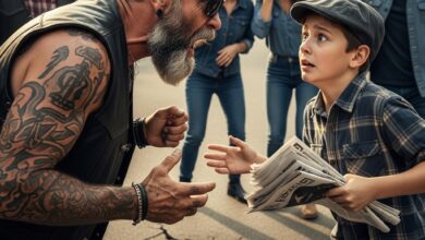 A biker suddenly screamed inches from a young paperboy’s face on a quiet street corner — and seconds later, the…