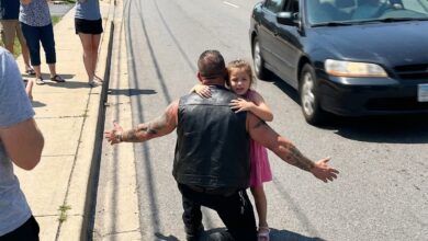 A Giant Biker Knelt in Traffic to Shield a Little Girl — When the Car Finally Stopped, Everyone Fell Silent
