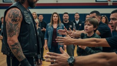 No one expected a leather-vested biker to be the most dangerous sight at a school assembly already spiraling toward panic…