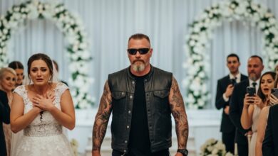 The Bride Broke Down Mid-Vows — When a Biker Stepped Onto the Stage, the Entire Hall Held Its Breath