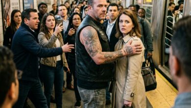 The moment a rough-looking biker stepped forward in a crowded subway station and placed his hand on a woman’s shoulder,…