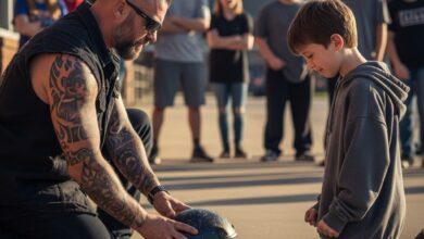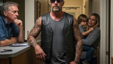 No one could explain why a tattooed biker stood motionless outside an elementary school in the pouring rain—only that his…