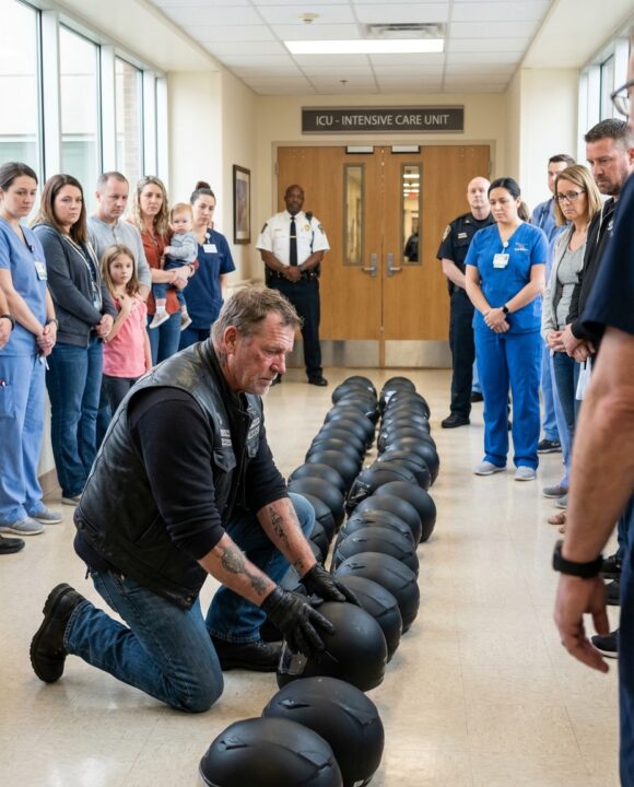 A resident tried to usher them aside. They didn’t argue. Didn’t speak. They simply placed more helmets down, extending the line toward the ICU doors like a silent message no one could read.