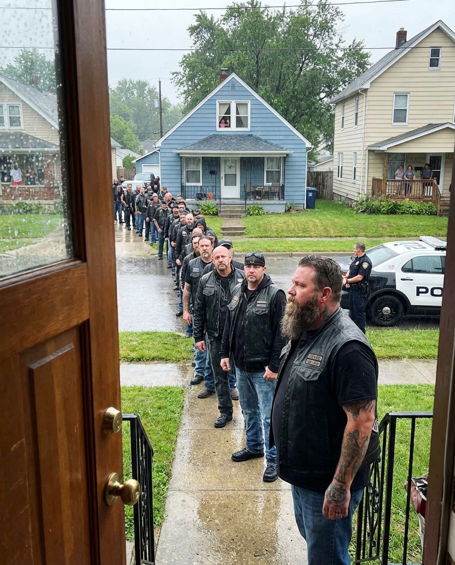 Forty Bikers Stood Silent in the Rain Outside a Small House — The Neighbors Watched from Behind Their Curtains