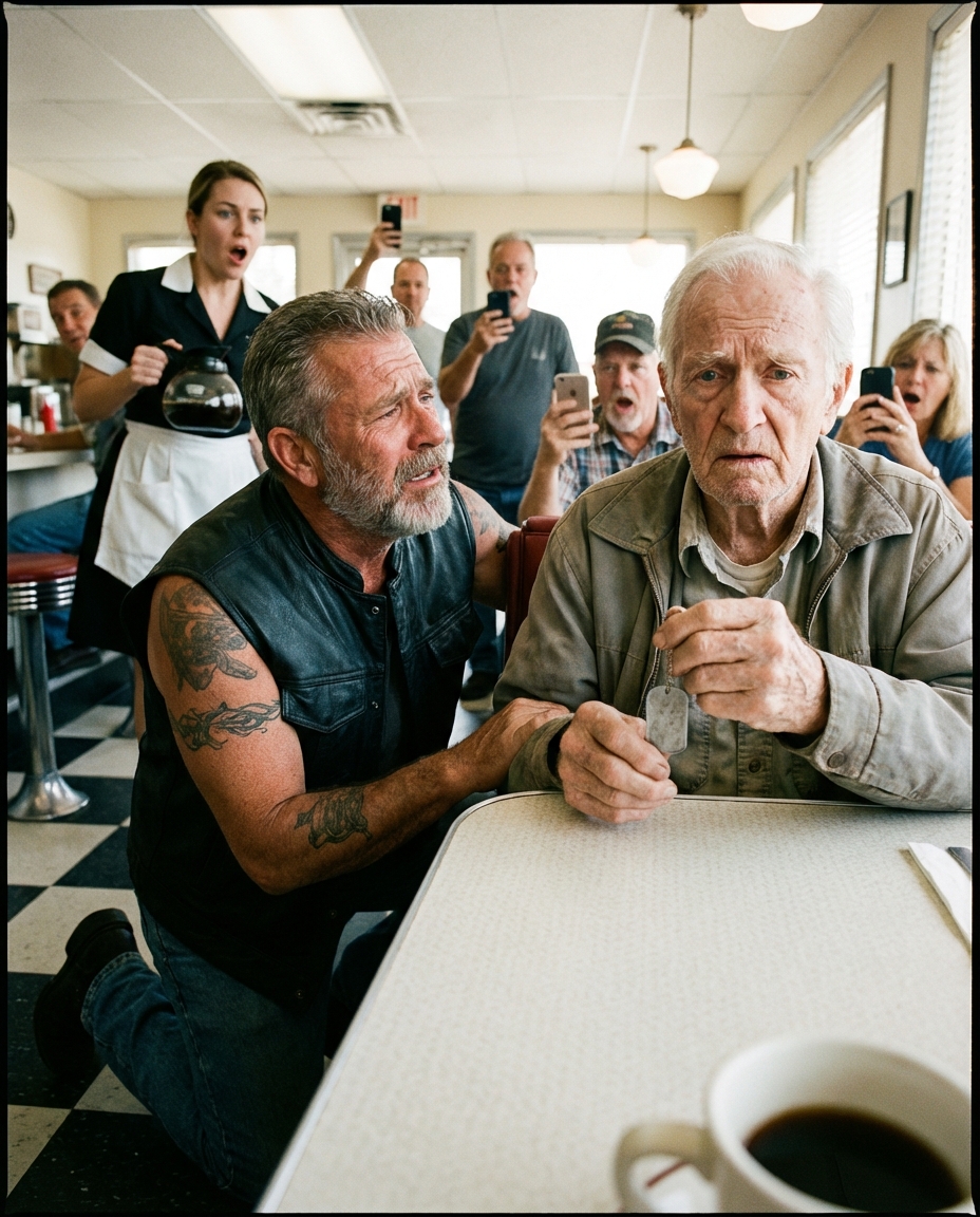 The entire diner went silent when a heavily tattooed biker dropped to his knees in front of a frail old man, as if he owed him something no one else could see.