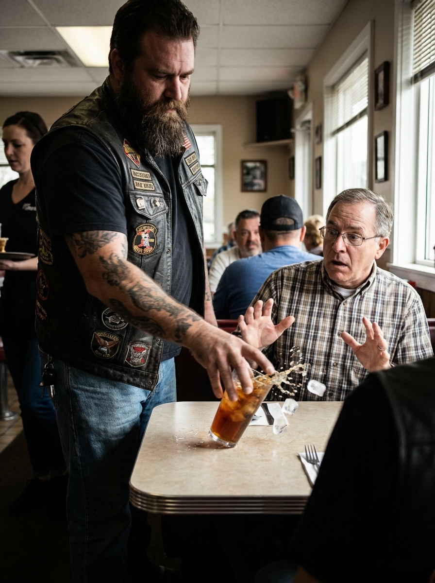 I was halfway through a quiet lunch when a biker deliberately knocked over my glass of iced tea… and before I could even stand up, he looked straight at me and said something that made me freeze.
